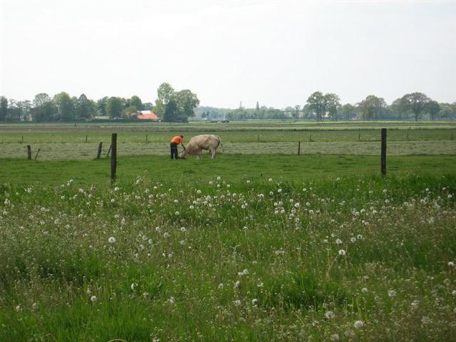stukje verder is een boer bezig met een koe die net een kalfje