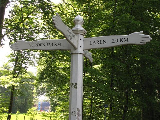 kruispunt vlak na Huize Ross. Een mooie wegwijzer wijst de de weg naar Laren.
