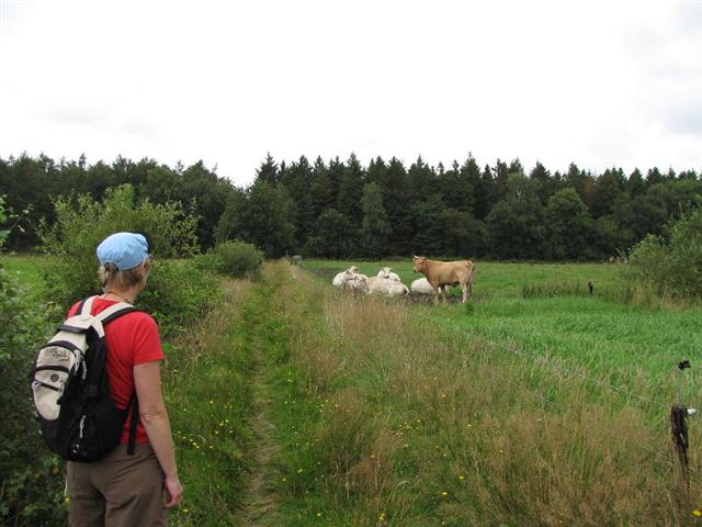 Even lopen we over een open stukje langs de herkauwende koeien. Daarna gaat