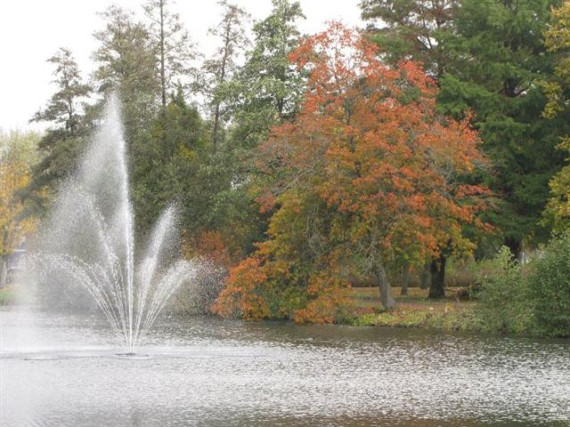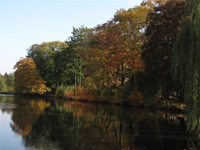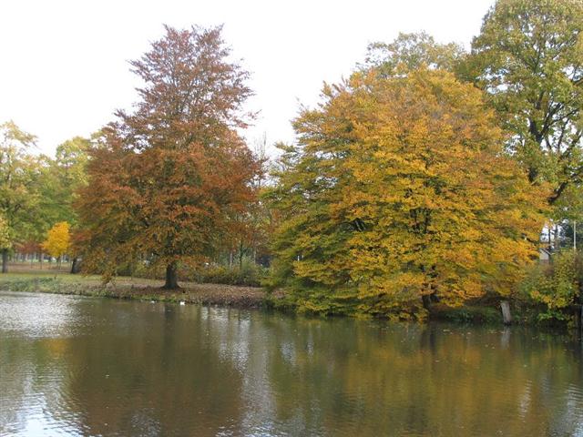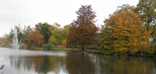 een park aangelegd waar de bomen in allerlei prachtige herfsttinten staan.