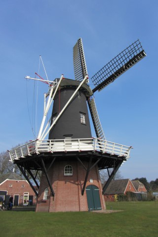 Bij Gasselternijveen fietsen we langs molen de Juffer die hoog op zijn voetstuk staat.
