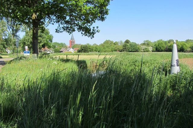 Zodra de kerktoren van Thorn in zicht komt zien we de grenspalen weer opduiken en rijden we Nederland binnen.