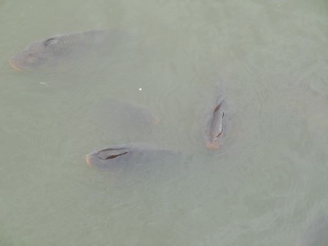 Frouwkje wijst mij op de grote hoeveelheid forse vissen die in de slotgracht rondzwemmen.