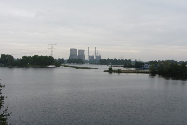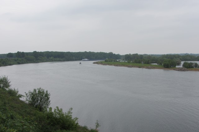 De Maas ligt nu een stuk lager dan waar wij fietsen, en we hebben een mooi uitzicht over de rivier.